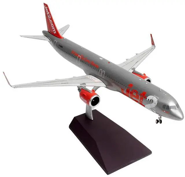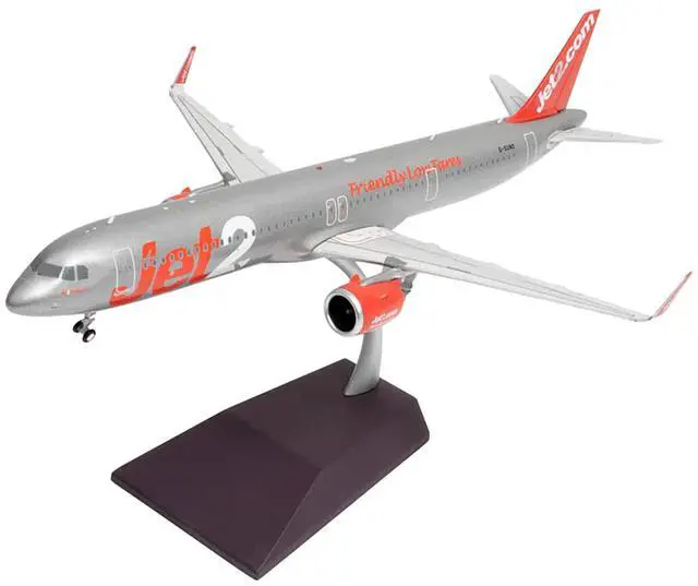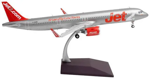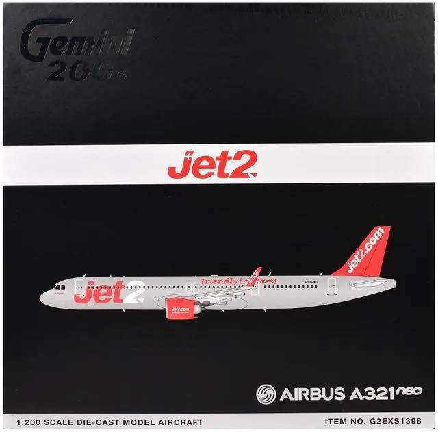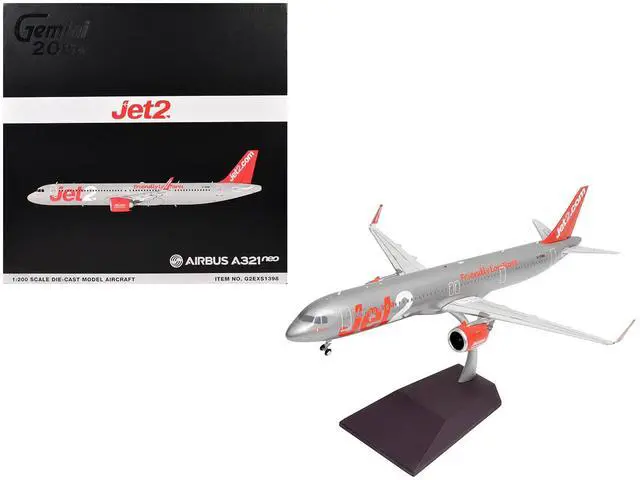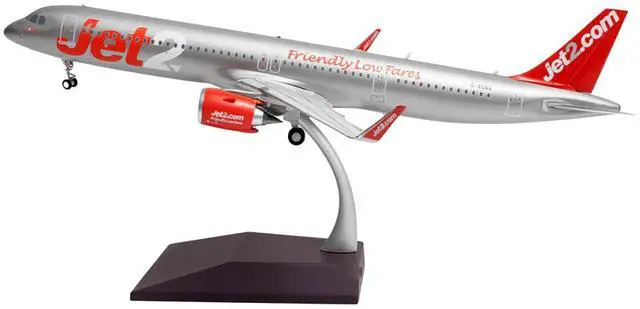 Brand new 1/200 scale diecast airplane model of Airbus A321neo Commercial Aircraft "Jet2" (G-SUNO) Silver with Red Tail "Gemini 200" Series die cast model by GeminiJets.
