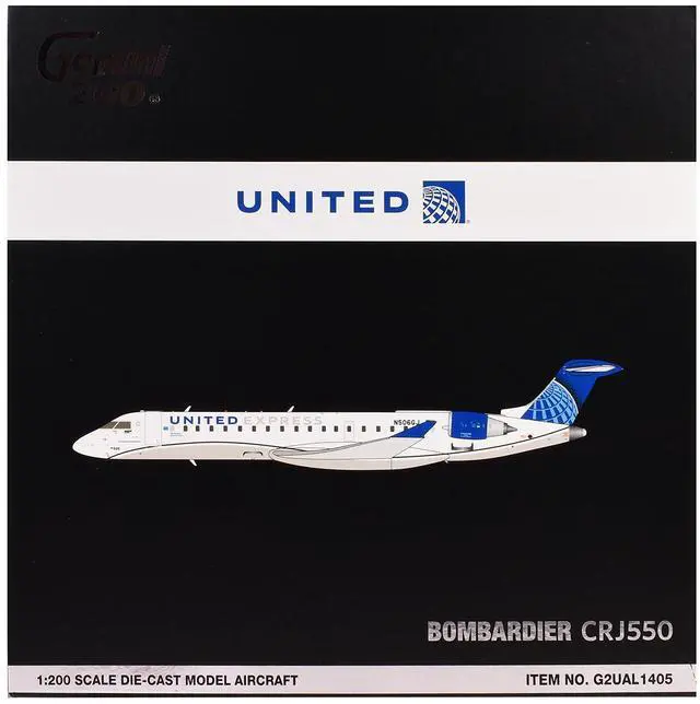 Brand new 1/200 scale diecast airplane model of Bombardier CRJ550 Commercial Aircraft "United Express" (N506GJ) White with Blue Tail "Gemini 200" Series die cast model by GeminiJets.