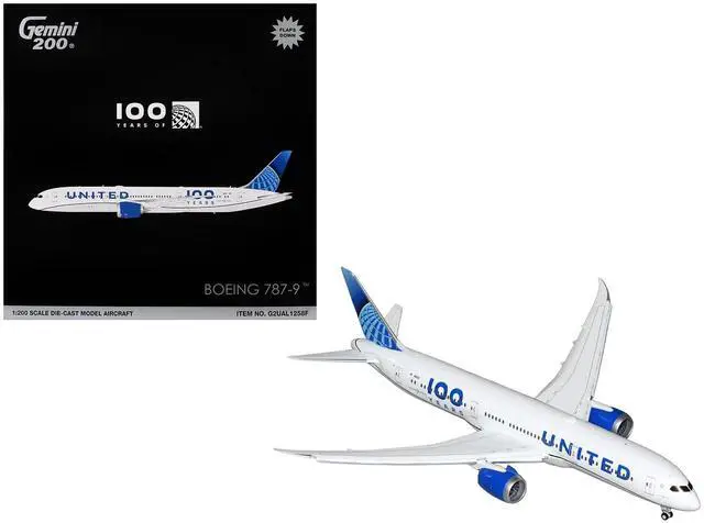 Brand new 1/200 scale diecast airplane model of Boeing 787-9 Commercial Aircraft with Flaps Down "United Airlines 100 Years" (N61101) White with Graphics and Blue Tail "Gemini 200" Series die cast model by GeminiJets.