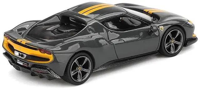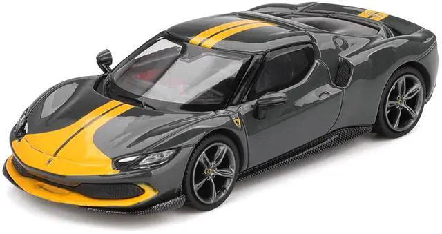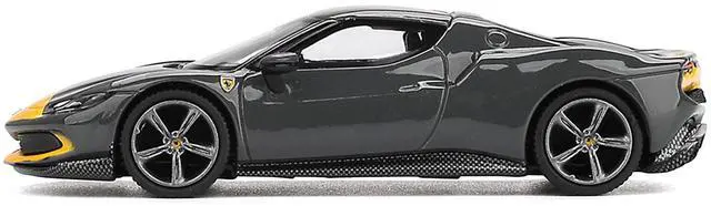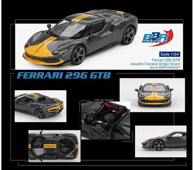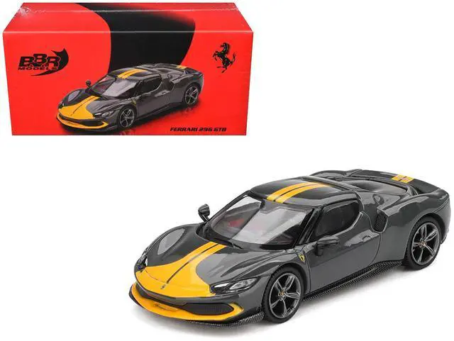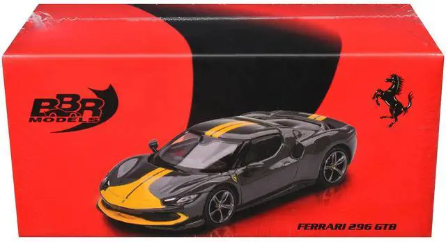 Brand new 1/64 scale diecast car model of Ferrari 296 GTB Assetto Fiorano Grigio Scuro (Dark Gray) with Yellow Stripes die cast model car by BBR Models.