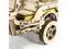 The jeep has front wheel-steering. The hood opens and closes and is secured with two clips, and the windshield tilts.
