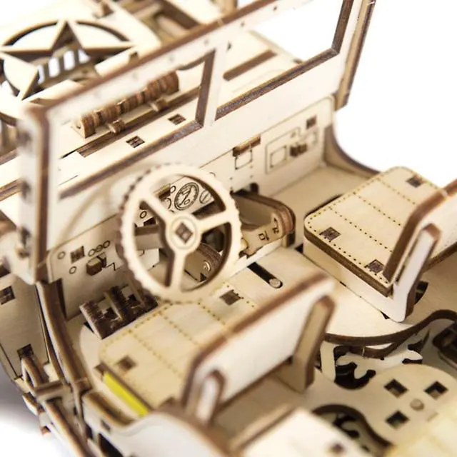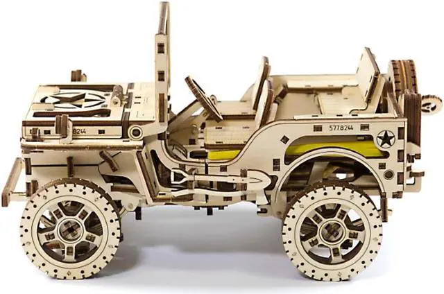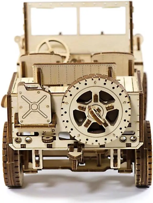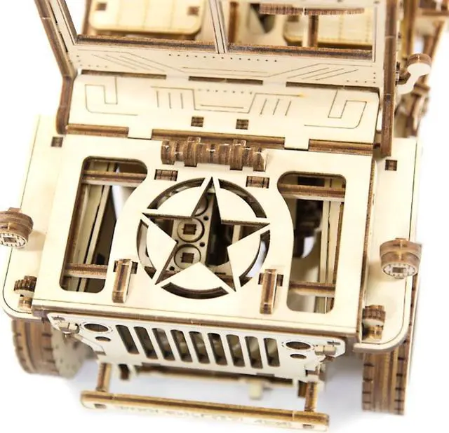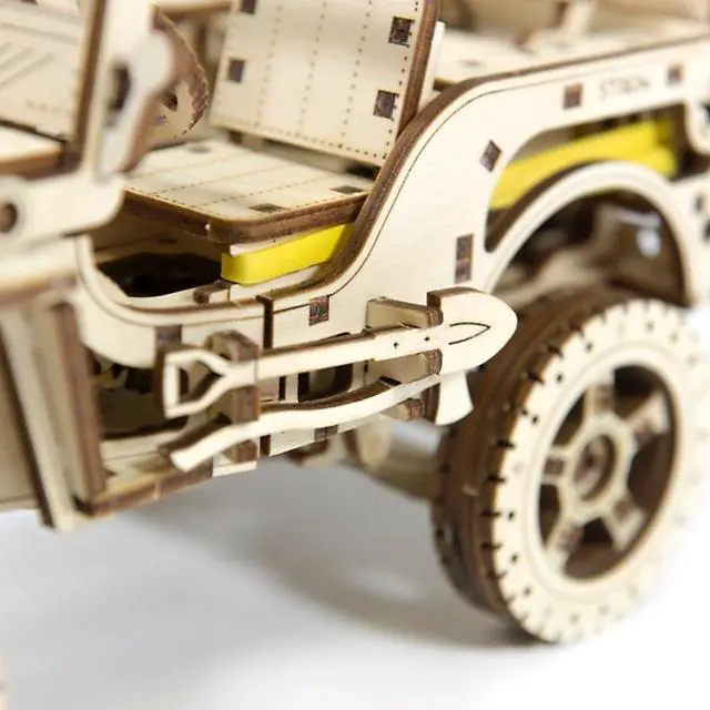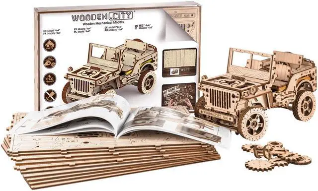 Key Features: A wood craft model with four-wheel drive and independent suspension on both axles, a lever to switch direction of movement and a drive shaft and semi-axle shafts with crossings, just like you find on a real jeep Three moving pedals, each spring-loaded with its own rubber band control Details are laser cut and ready to assemble; assemble without glue Made from Eco-Friendly birch plywood This 4x4 off-road vehicle moves up to 2 meters! Wooden. City' s 4× 4 3D puzzle of a famous American off-road vehicle. This model, once assembled is a complicated mechanism with fine details. It’ s the precursor of today’ s SUV, a vehicle with a masculine character! Today, both the jeep and its successor, the SUV, are expensive all-terrain vehicles designed for rugged individuals. They overcome obstacles, dust, roads, and hazards! They put real adventures right into your hands! Our "4x4" exemplifies our difficult 3D puzzles for adults. This "4x4" drives up to 2 meters. After assembly, set the lever position to forward or backward, put the locking lever in the stop position, wind up the model with the key (you’ ll find the key in the spare wheel) and then lower the locking lever.