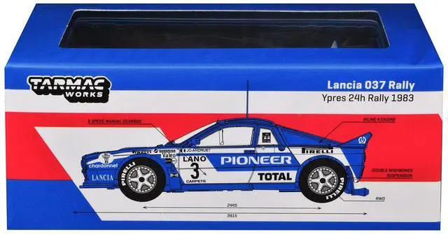 Brand new 1/64 scale diecast car model of Lancia 037 Rally #3 Jean-Claude Andruet - Francoise Sappey 2nd Place "Ypres 24 Hours Rally" (1983) "Hobby64+" Series die cast model car by Tarmac Works.