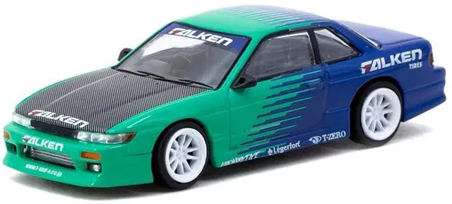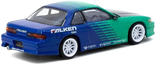 Brand new 1/64 scale diecast model of Nissan Silvia (S13) Vertex RHD (Right Hand Drive) "Falken Tires" Green and Blue wuth Carbon Hood "Global64" Series die cast model by Tarmac Works.