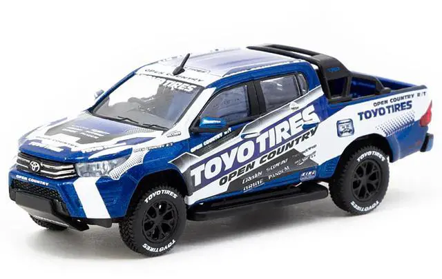 Brand new 1/64 scale diecast model car of Toyota Hilux Pickup Truck RHD (Right Hand Drive) "Toyo Tires" White and Blue with Graphics "Hobby64" Series die cast model car by Tarmac Works.