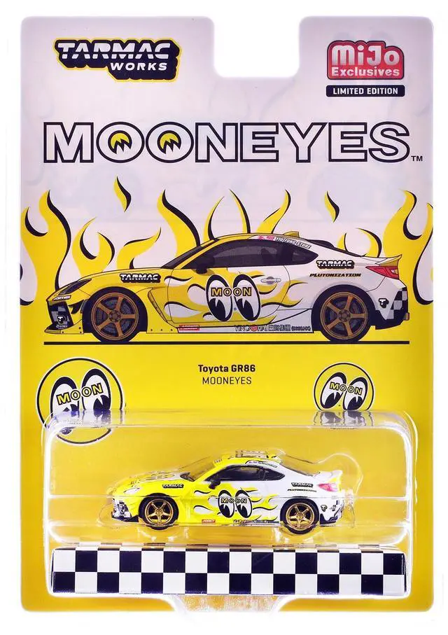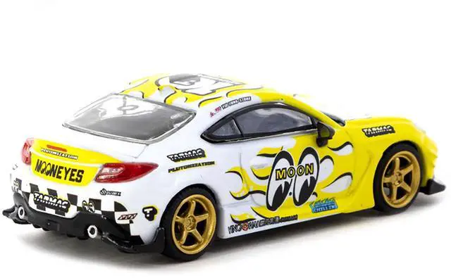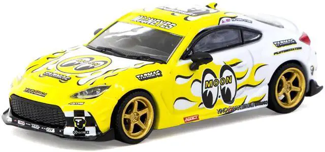 Brand new 1/64 scale diecast model of Toyota GR86 RHD (Right Hand Drive) "MoonEyes" White with Yellow Flames and Graphics "Global64" Series die cast model by Tarmac Works.