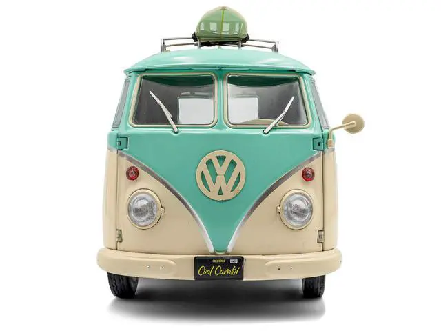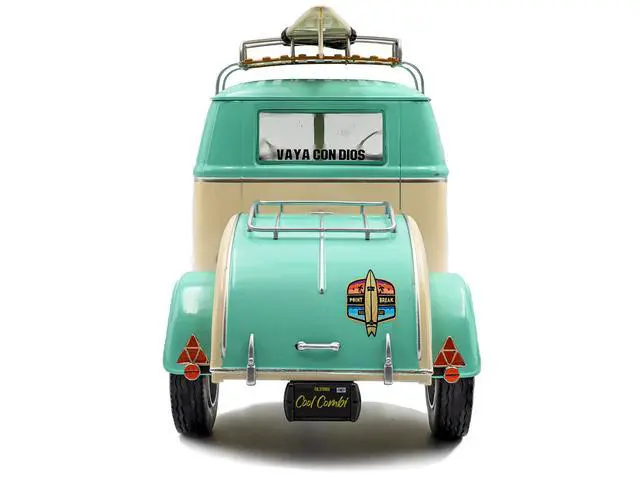 Brand new 1/18 scale diecast car model of 2024 Volkswagen Cool Combi Van with Trailer "Long Beach Surfing Club" Mint Green and Cream with Roof Rack and Surfboard die cast model car by Solido.