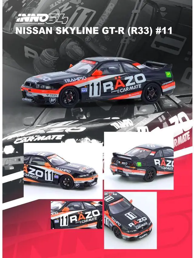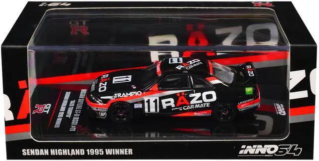 Brand new 1/64 scale diecast car model of Nissan Skyline GT-R (R33) RHD (Right Hand Drive) #11 "Razo Trampio" N1 Super Endurance Series "Sedan Highland" (1995) die cast model car by Inno Models.