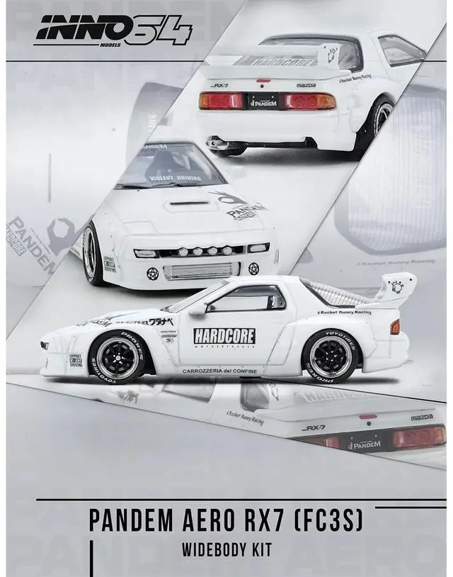 Brand new 1/64 scale diecast car model of Mazda RX7 (FC3S) "Pandem Aero" Widebody Kit White with Graphics die cast model car by Inno Models.