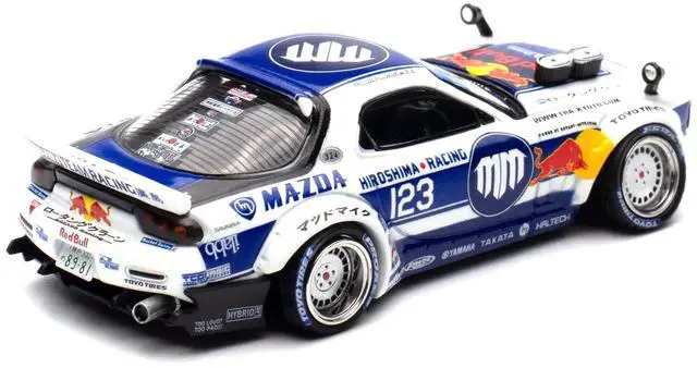 Brand new 1/64 scale diecast car model of Mazda RX-7 (FD3S) RHD (Right Hand Drive) #123 "Pandem Rocket Bunny MADBUL Gen 7.3" White and Blue with Graphics "MadLab Collection 01" die cast model car by Inno Models.