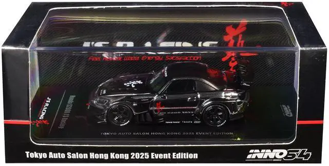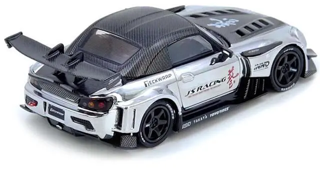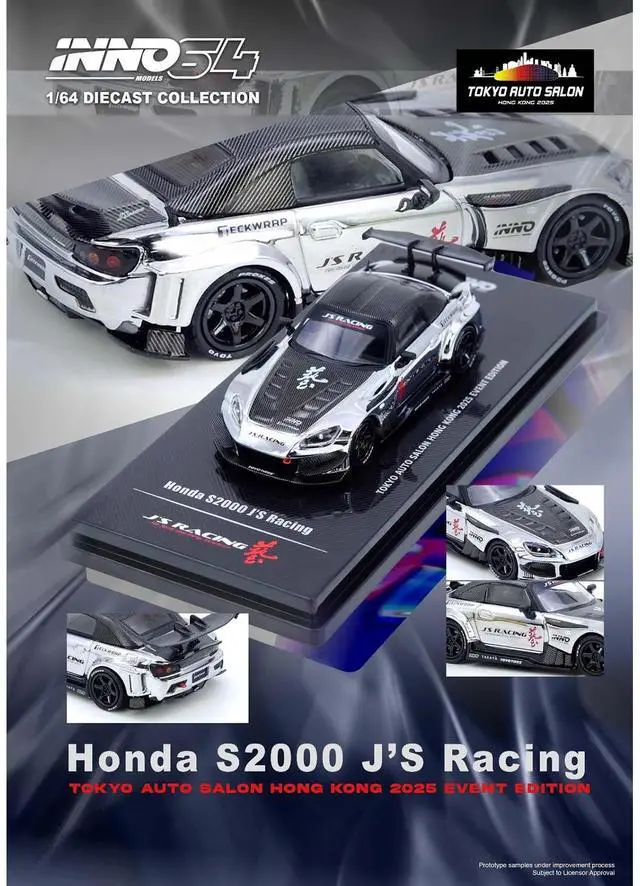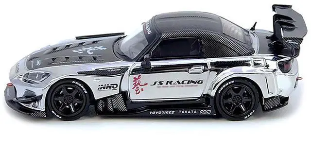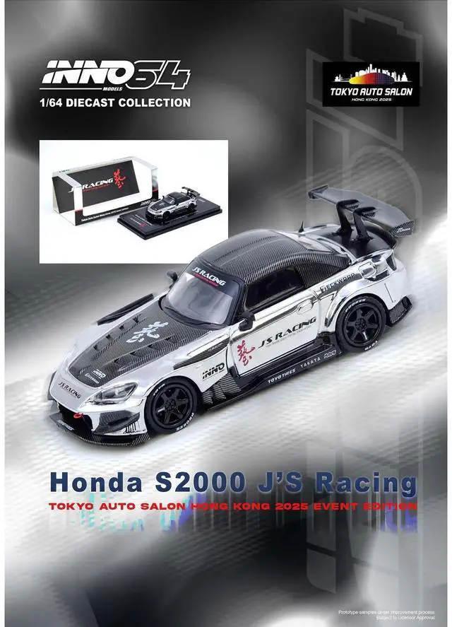 Brand new 1/64 scale diecast car model of Honda S2000 RHD (Right Hand Drive) "J's Racing" Chrome Silver with Carbon Hood and Top with Graphics "Tokyo Auto Salon Hong Kong 2025 Event Edition" die cast model car by Inno Models.