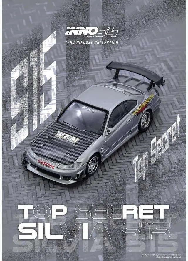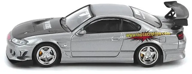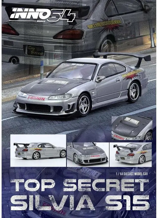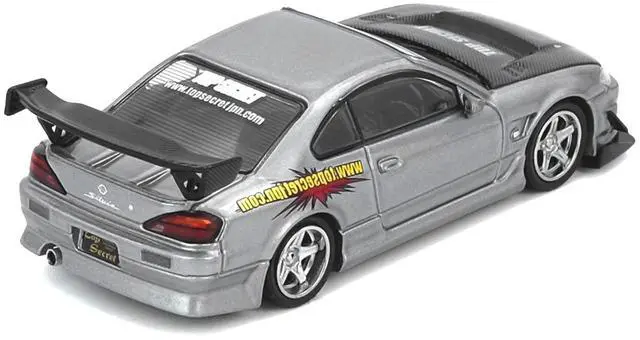 Brand new 1/64 scale diecast car model of Nissan "Top Secret" Silvia (S15) RHD (Right Hand Drive) Silver Metallic with Carbon Hood die cast model car by Inno Models.