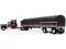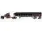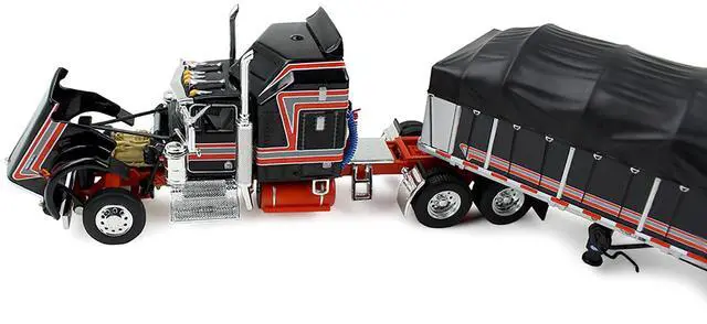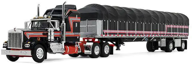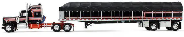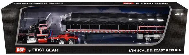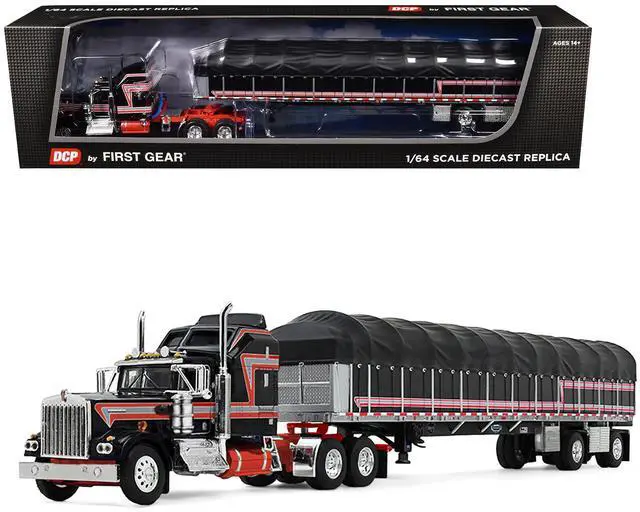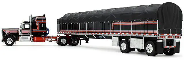 Brand new 1/64 scale diecast model of Kenworth W900A with 60" Aerodyne Sleeper and 53 Wilson Roadbrute Flatbed Trailer with Covered Wagon Black with Red Stripes die cast model by DCP/First Gear.