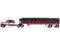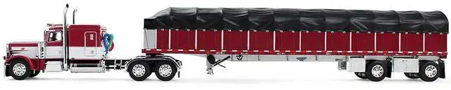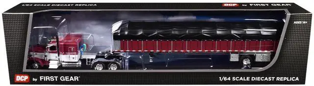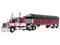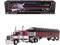 Brand new 1/64 scale die-cast model of Peterbilt 389 with 63" Flat Top Sleeper & 53 Wilson Roadbrute Flatbed Trailer with Covered Wagon Maroon with White Stripes die cast model by DCP/First Gear.