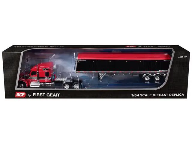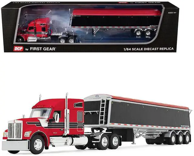 Brand new 1/64 scale diecast model of Kenworth W990 with 76" Mid-Roof Sleeper and Lode King Distinction Hopper Trailer Red and Black die cast model by DCP/First Gear.