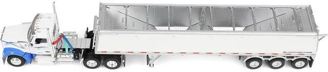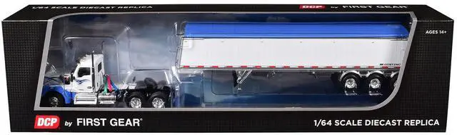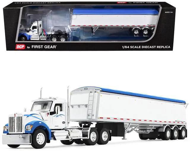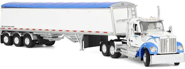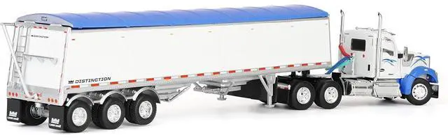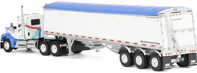 Brand new 1/64 scale diecast model of Kenworth W990 Day Cab and Lode King Distinction Hopper Trailer White and Blue die cast model by DCP/First Gear.