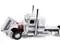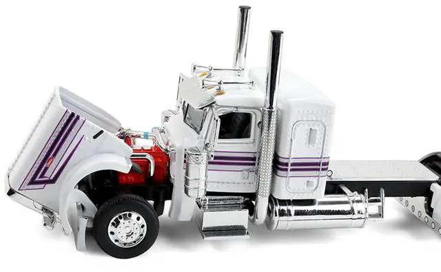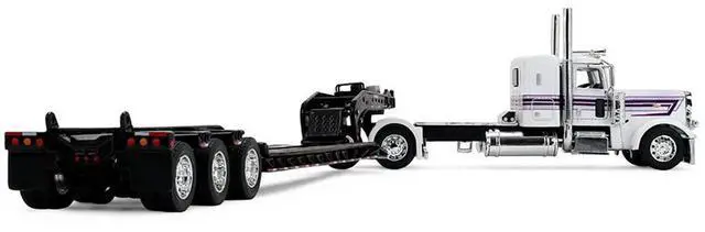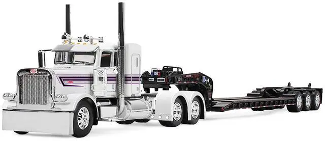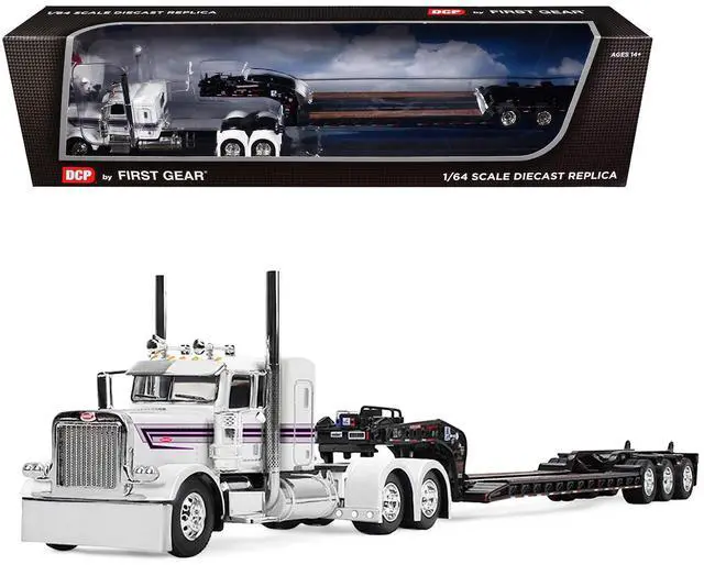 Brand new 1/64 scale diecast model of Peterbilt 389 with 36" Flat Top Sleeper and Fontaine Magnitude Lowboy Trailer White with Black Stripes die cast model by DCP/First Gear.