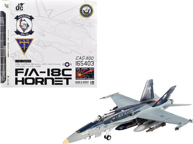 Brand new 1/72 scale diecast model of McDonnell Douglas F/A-18C Hornet Aircraft "VFA-34 Blue Blasters, USS Carl Vinson, Last Cruise" (2018) United States Navy die cast model by JC Wings.