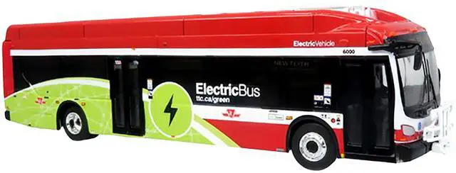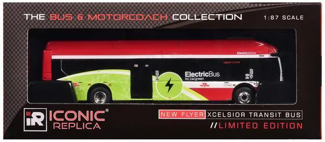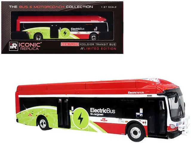 Brand new 1/87 (HO) scale diecast model of New Flyer Xcelsior Charge NG Electric Transit Bus "TTC (Toronto Transit Commission) " Red and Green with White Stripes "The Bus & Motorcoach Collection" die cast model by Iconic Replicas.