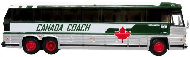 Brand new 1/87 (HO) scale diecast model of 1980 MCI MC-9 Crusader II Intercity Coach Bus "Hamilton via 8" "Canada Coach" "Vintage Bus & Motorcoach Collection" die cast model by Iconic Replicas.