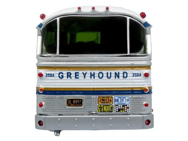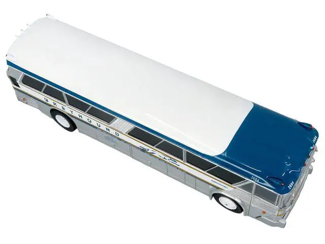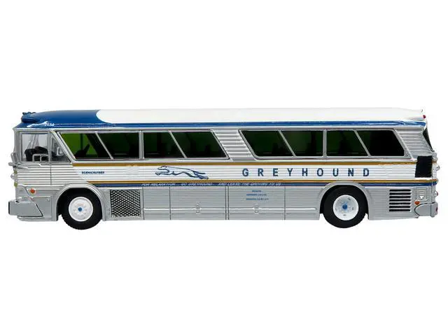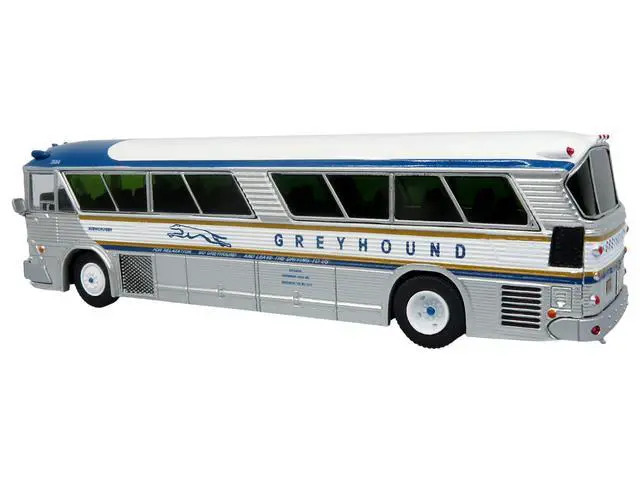 Brand new 1/87 (HO) scale diecast model of 1964 MCI MC-5A Coach Bus "Greyhound Golden Anniversary" Silver with Blue and Gold Stripes "Vintage Bus & Motorcoach Collection" Limited Edition to 504 pieces Worldwide die cast model by Iconic Replicas.
