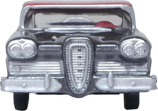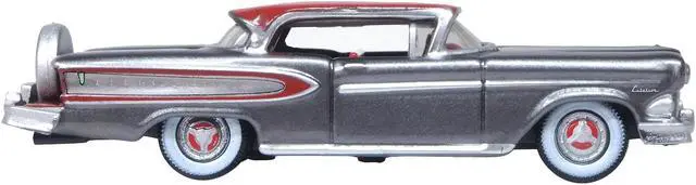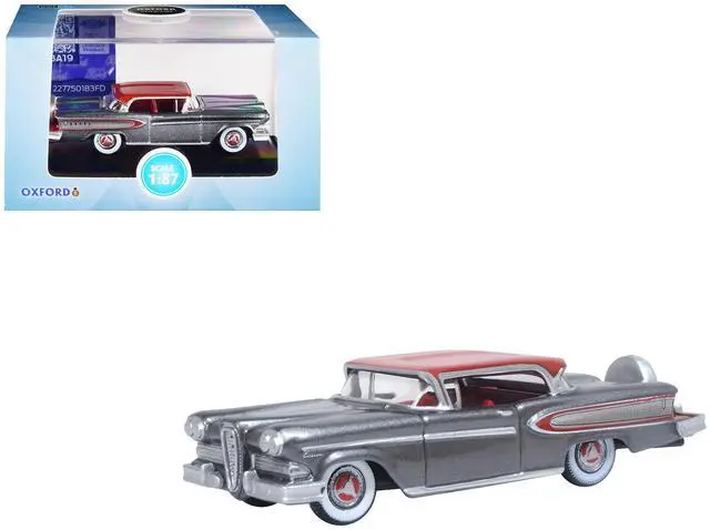 Brand new 1/87 (HO) scale diecast car model of 1958 Edsel Citation Silver Gray Metallic with Ember Red Top and Red Interior die cast model car by Oxford Diecast.