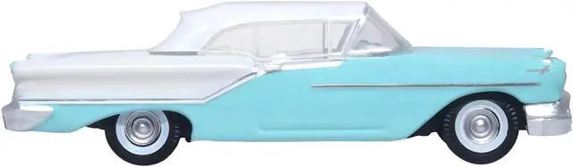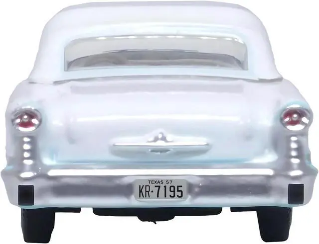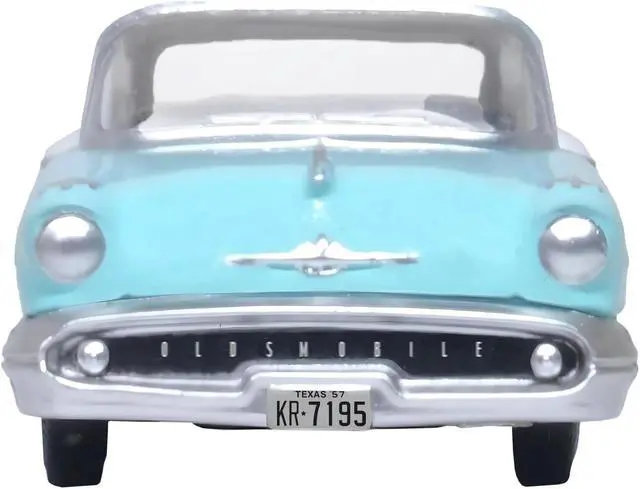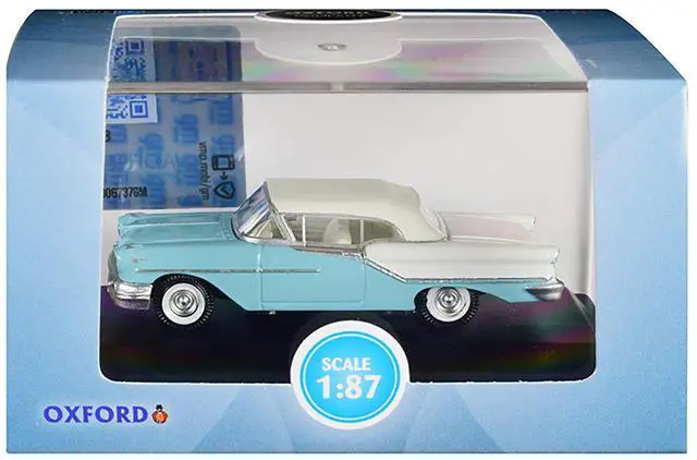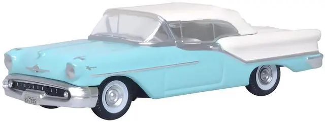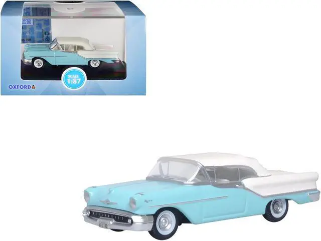 Brand new 1/87 (HO) scale diecast car model of 1957 Oldsmobile 88 Convertible (Top-Up) Banff Blue and Alcan White with White Interior die cast model car by Oxford Diecast.