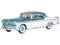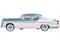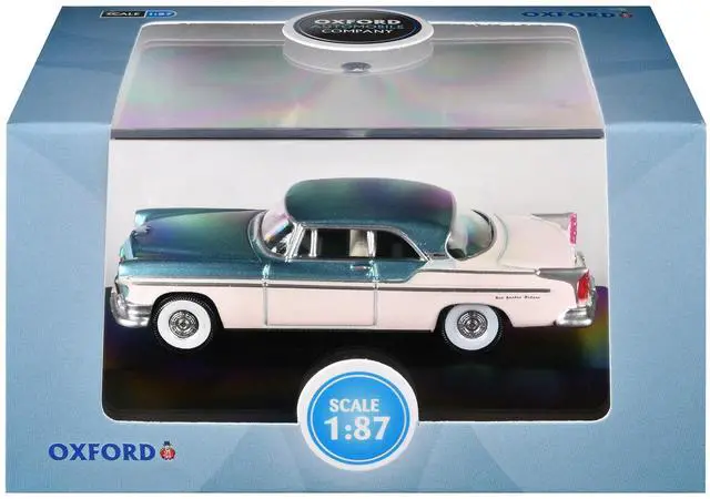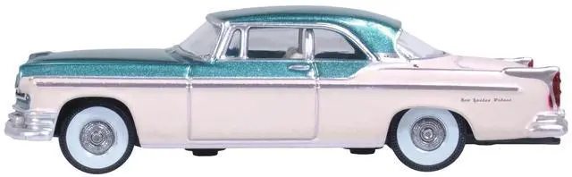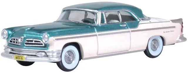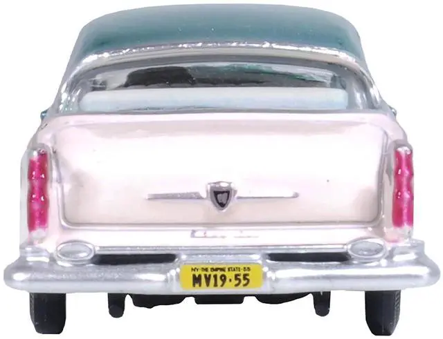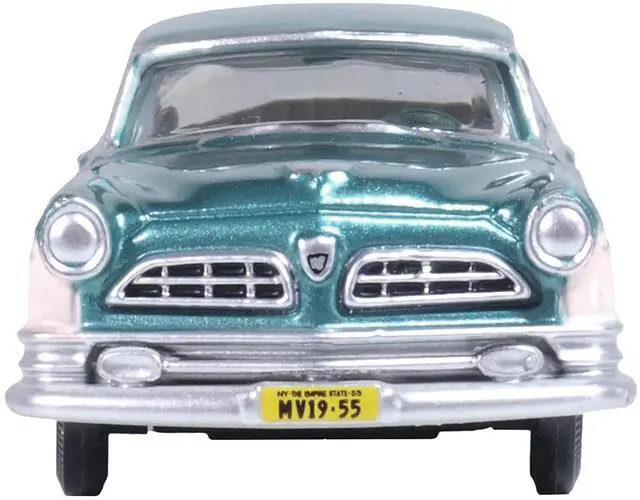 Brand new 1/87 (HO) scale diecast car model of 1955 Chrysler New Yorker Deluxe St. Regis Jade Green Metallic and Cream die cast model car by Oxford Diecast.