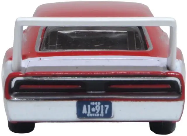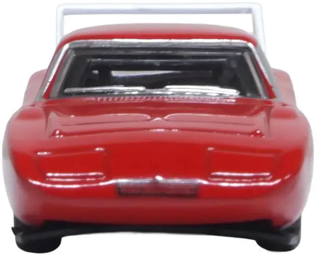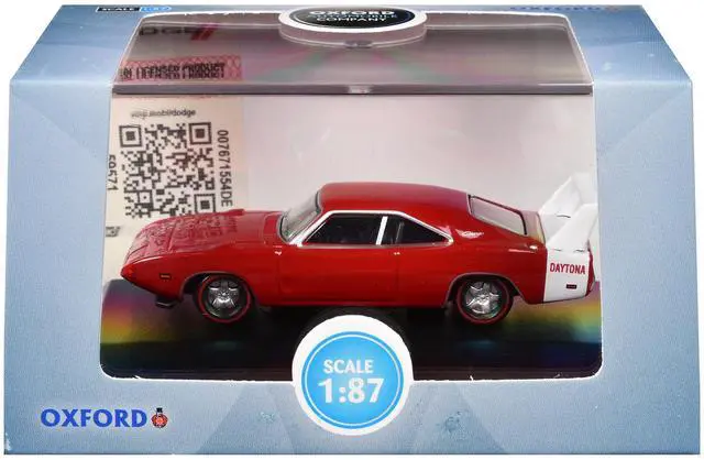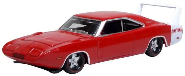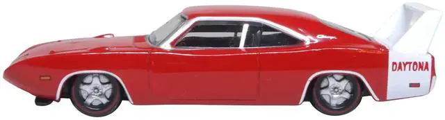 Brand new 1/87 (HO) scale diecast car model of 1969 Dodge Charger Daytona Red with White Stripe die cast model car by Oxford Diecast.
