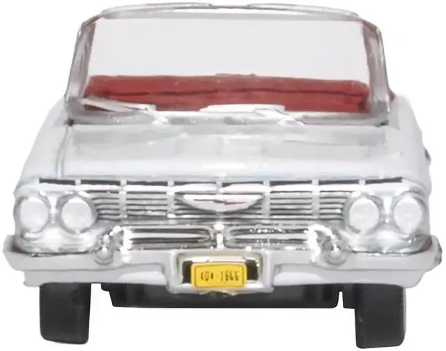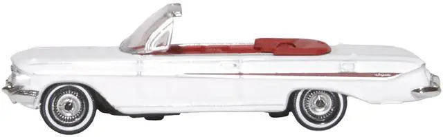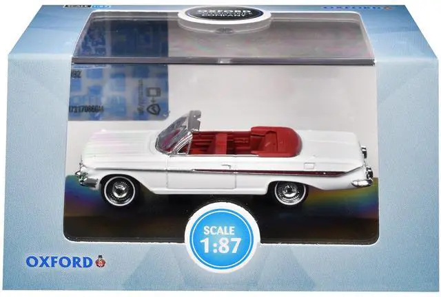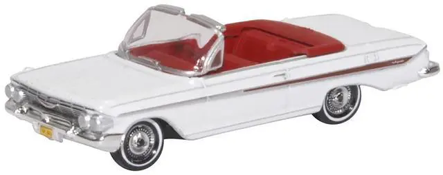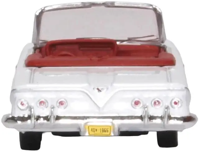 Brand new 1/87 (HO) scale diecast car model of 1961 Chevrolet Impala Convertible Ermine White with Roman Red Interior die cast model car by Oxford Diecast.