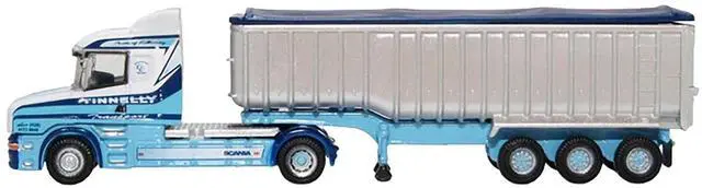 Brand new 1/148 (N) scale diecast car model of Scania T-Cab Truck RHD (Right Hand Drive) with Covered Dump Trailer "Tinnelly" White with Blue Graphics die cast model car by Oxford Diecast.