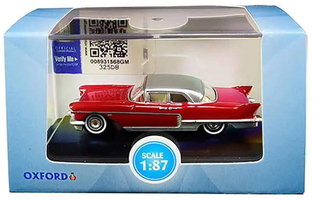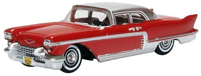 Brand new 1/87 (HO) scale diecast car model of 1957 Cadillac Eldorado Brougham Dakota Red with Silver Metallic Top die cast model car by Oxford Diecast.