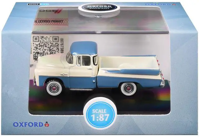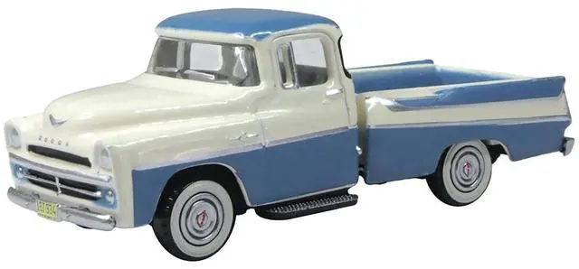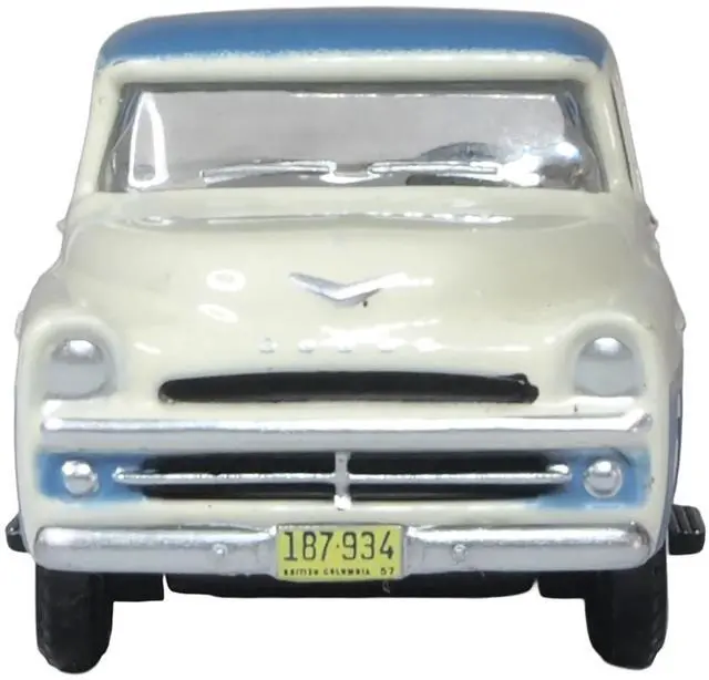 Brand new 1/87 (HO) scale diecast car model of 1957 Dodge D100 Sweptside Pickup Truck Ice Blue and Glacier White die cast model car by Oxford Diecast.