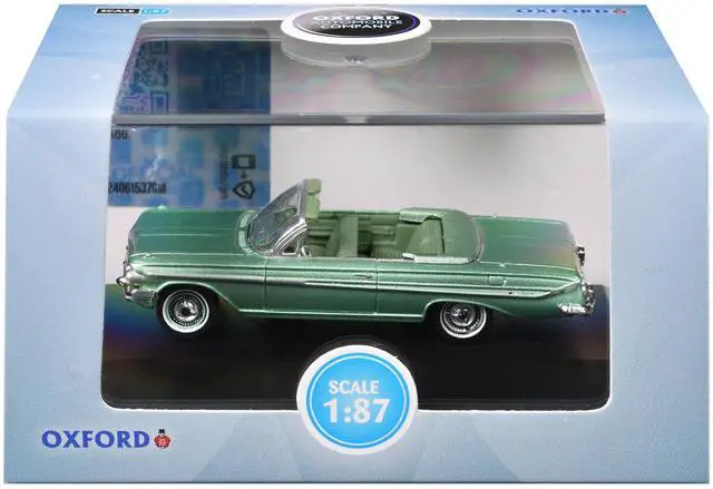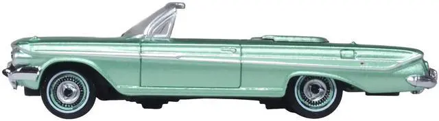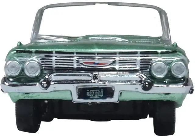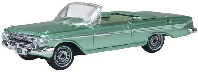 Brand new 1/87 (HO) scale diecast car model of 1961 Chevrolet Impala Convertible Arbor Green Metallic with Green Interior die cast model car by Oxford Diecast.