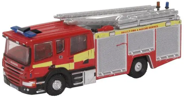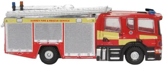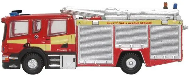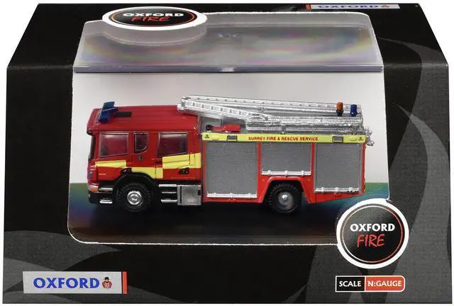 Brand new 1/148 (N) scale diecast car model of Scania Pump Ladder Fire Engine "Surrey Fire and Rescue" Red with Yellow Stripes die cast model car by Oxford Diecast.