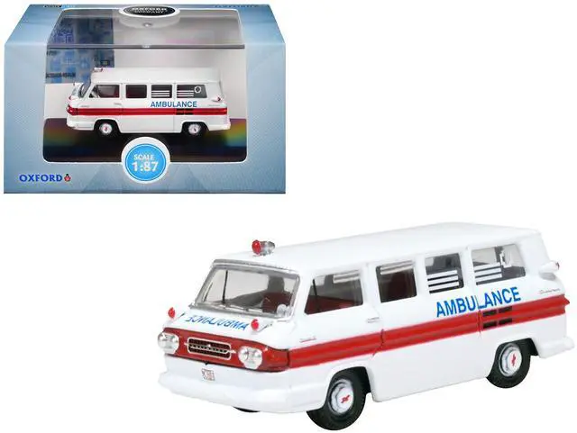 Brand new 1/87 (HO) scale diecast car model of 1962 Chevrolet Corvair Greenbrier AmbleWagon Ambulance White with Red Stripes die cast model car by Oxford Diecast.