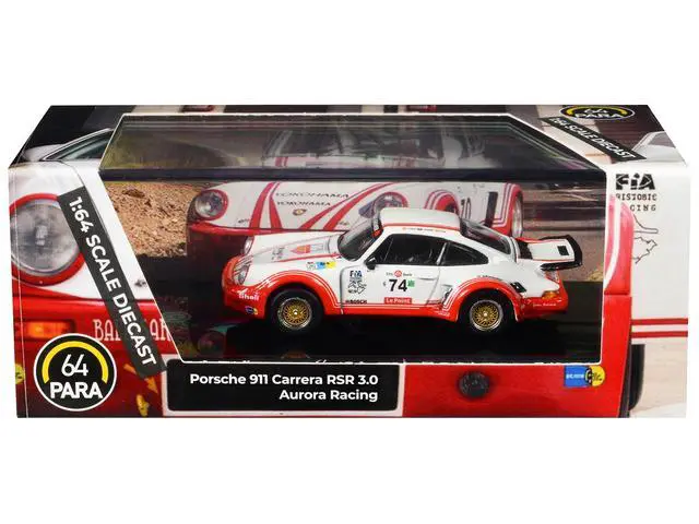 Brand new 1/64 scale diecast car model of Porsche 911 Carrera RSR 3.0 #74 "Aurora Racing" White with Red Stripes die cast model car by Paragon.