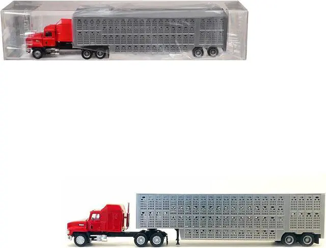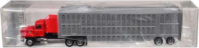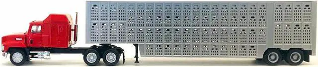 Brand new 1/87 (HO) scale plastic car model of Mack CH 613 with Sleeper Cab Red with Silver Livestock Trailer plastic model car by Promotex.