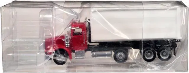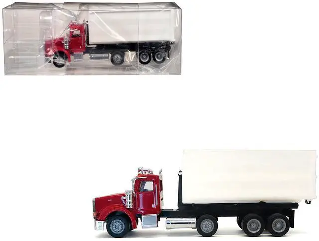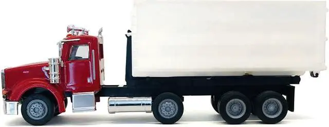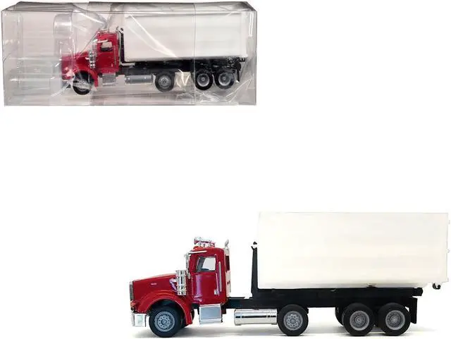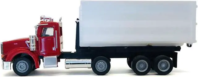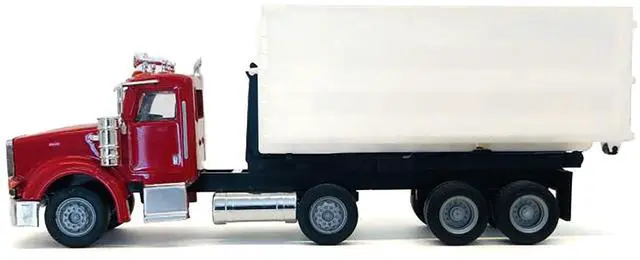 Brand new 1/87 (HO) scale plastic car model of Peterbilt 367 Roll-Off Dump Truck Red with White Box plastic model car by Promotex.