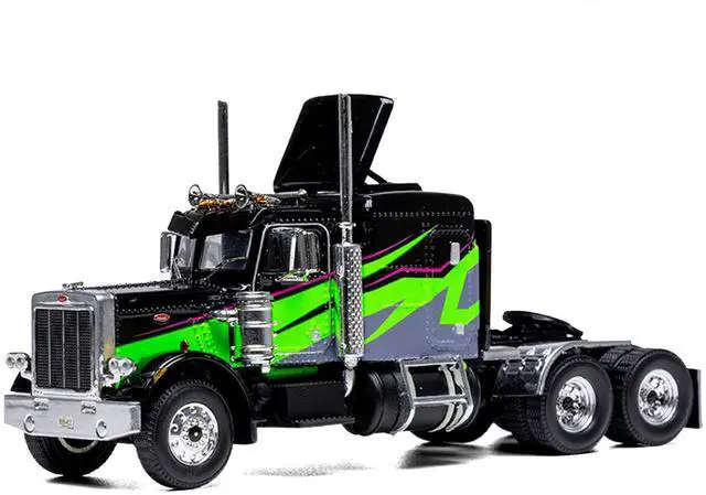 Brand new 1/64 scale diecast model of 1973 Peterbilt 359 Truck Tractor Black and Lime Green with Graphics die cast model by IXO Models.