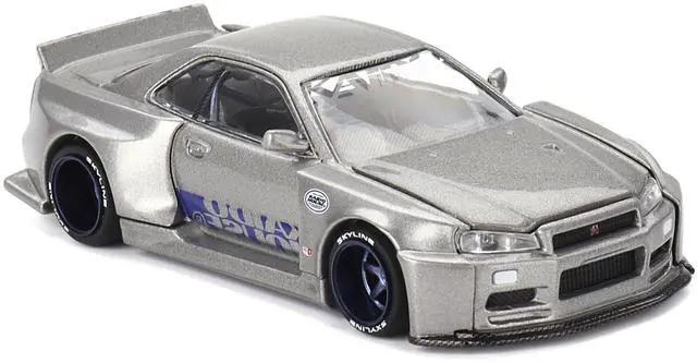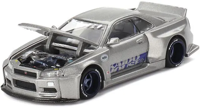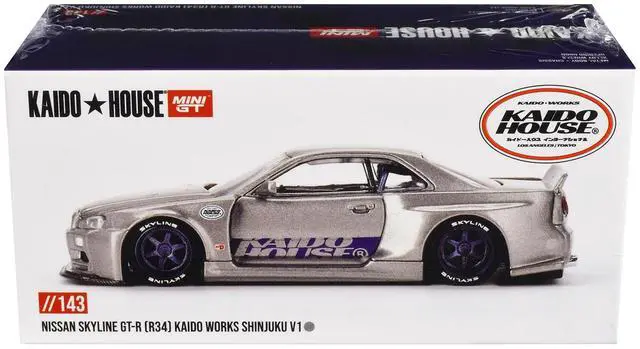 Brand new 1/64 scale diecast car model of Nissan Skyline GT-R (R34) "Kaido Works Shinjuku V1" RHD (Right Hand Drive) Silver Metallic (Designed by Jun Imai) "Kaido House" Special die cast model car by Mini GT.