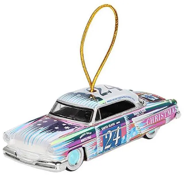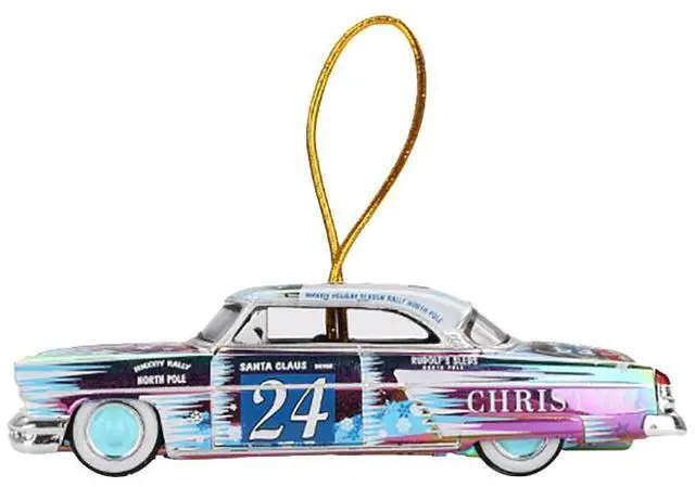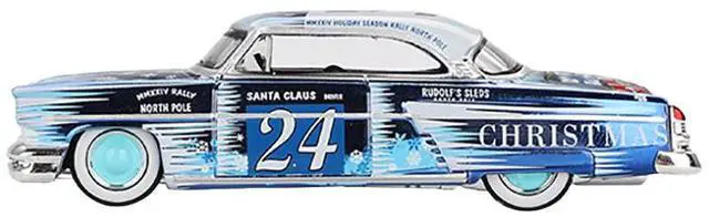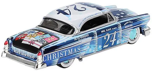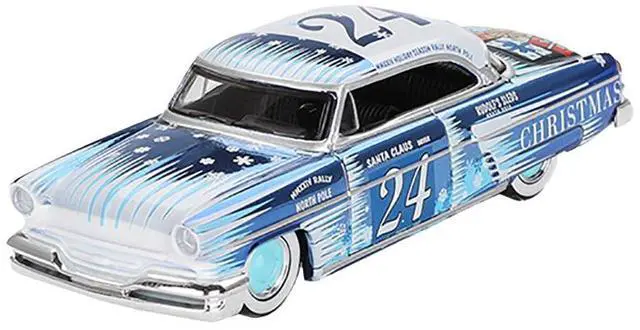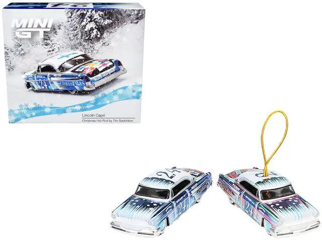 Brand new 1/64 scale die cast car models of 1954 Lincoln Capri "Christmas Hot Rod 2024 Edition by Tim Sadchikov" #24 Blue Metallic with Christmas Graphics and Lincoln Capri Tree Ornament Limited Edition to 9999 pieces Worldwide die-cast model cars by Mini GT.