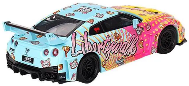 Brand new 1/64 scale diecast car model of Nissan 35GT-RR Ver. 1 "LB-Silhouette Works GT" Light Blue and Yellow with Graphics "LBWK KUMA" Limited Edition die cast model car by Mini GT.