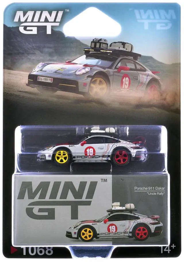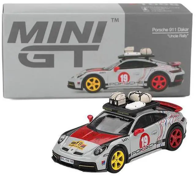 Brand new 1/64 scale diecast car model of Porsche 911 Dakar #19 "Uncle Rally" Gray with Graphics and Roof Rack Limited Edition die cast model car by Mini GT.