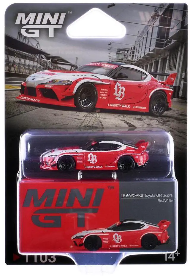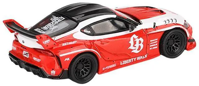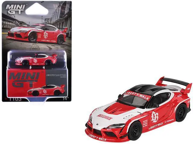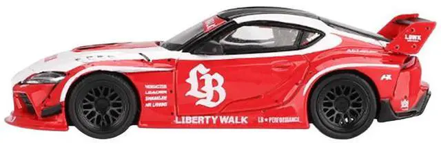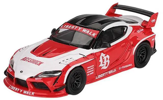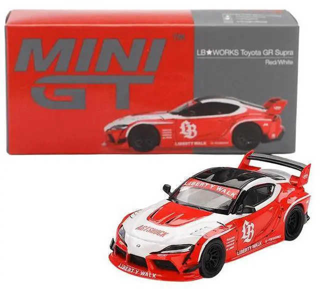 Brand new 1/64 scale diecast car model of Toyota GR Supra "LB-Works" Red with White Stripes and Black Top Limited Edition die cast model car by Mini GT.