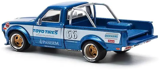 Brand new 1/64 scale diecast car model of Datsun Pandem 620 Pickup Truck #66 Blue Metallic with White Stripes and Graphics die cast model car by Pop Race.