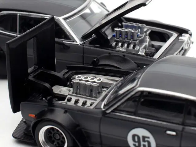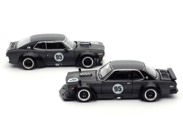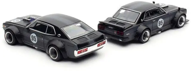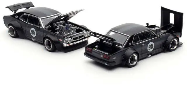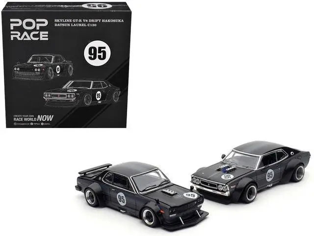 Brand new 1/64 scale diecast car model of Skyline GT-R V8 Drift "Hakosuka" RHD (Right Hand Drive) #95 Black and Datsun Laurel C130 RHD (Right Hand Drive) Black 2 Car Box Set "Hong Kong Toycar Salon 2025" die cast model car by Pop Race.