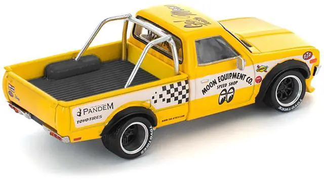 Brand new 1/64 scale diecast car model of Datsun Pandem 620 Pickup Truck "MoonEyes" Yellow with White Sides and Graphics die cast model car by Pop Race.