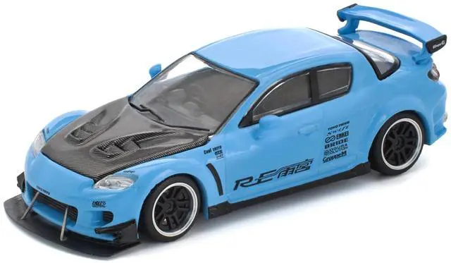 Brand new 1/64 scale diecast car model of Mazda RX8 RE-Amemiya Widebody RHD (Right Hand Drive) Light Blue with Carbon Hood die cast model car by Pop Race.