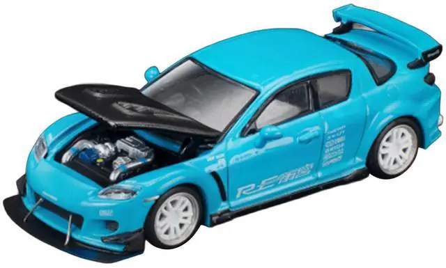 Brand new 1/64 scale diecast car model of Mazda RX8 RE Amemiya RHD (Right Hand Drive) Light Blue with Carbon Hood "Tokyo Auto Salon 2026" die cast model car by Pop Race.